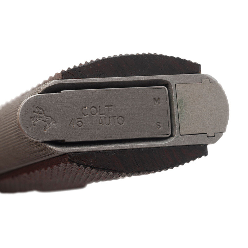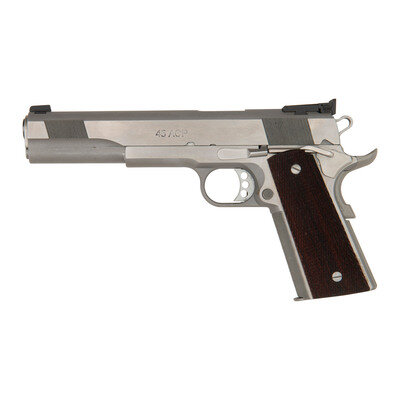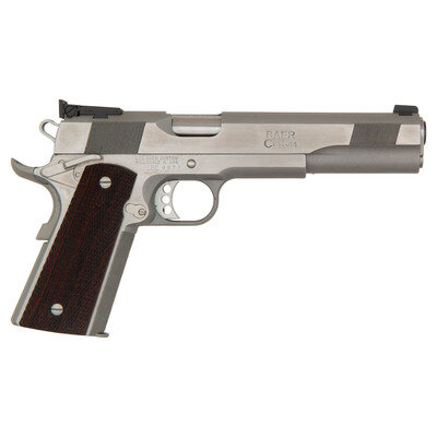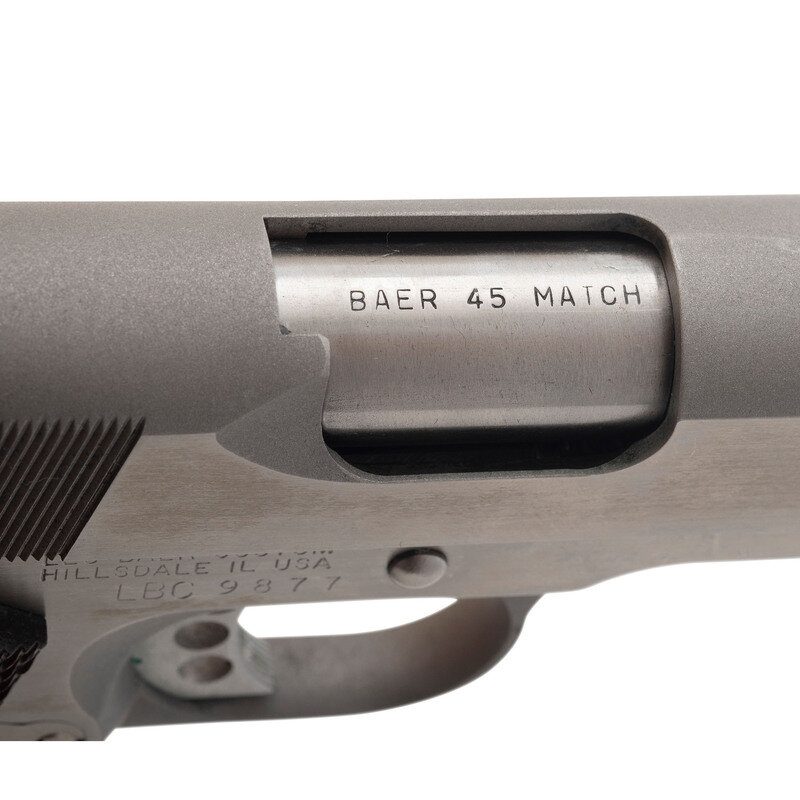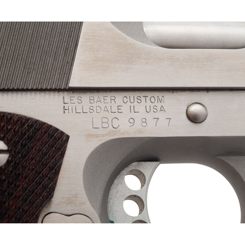 .45 ACP. 6" barrel length. SN: LBC9877. Matte stainless steel finish to the rounds with brushed flats and mounting checkered walnut grips. Short recoil operated single action autoloading pistol fed by detachable single stack magazines and mounting a long slide and barrel. Item is marked BAER/Custom on the right slide with the two-line address marking to the right frame. Caliber marking appears on the left slide. The handgun features LES BAER CUSTOM marked matted adjustable rear target and front blade sights, and a speed trigger. The NM pattern slide mounts front and rear cocking serrations with a NM barrel utilizing a stainless steel Baer bushing. Frame mounts a Baer beavertail grip safety with pad, a Baer checkered slide stop, and ambidexterous extended safety lever. The frame has a flat serrated mainspring housing and knurled front gripstrap. The ejection port is lowered and flared, and all components are fitted and tuned to the standards of Les Baer Custom. A synthetic buffer is attached to the spring guide. Comes with one COLT marked flush fitting magazine.