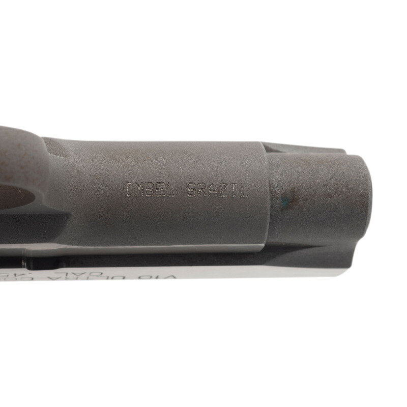 .45 ACP. 3.5" barrel length. SN: N459548. Brushed stainless finish to flats, matte to rounds, and mounting black rubber HOGUE grips. Short recoil operated single-action autoloading pistol fed by detachable single stack magazines. Item features a ported barrel and slide, a bushingless bull barrel, and Novak pattern sights. Controls include ambidexterous extended safety lever, skeletonized commander hammer, flat serratted mainspring housing, and an extended grip safety. Markings include the IMBEL BRAZIL mark on the frame, and standard make and model markings overall. Comes with one stainless finish magazine.