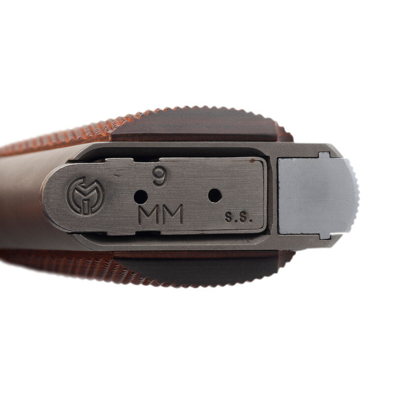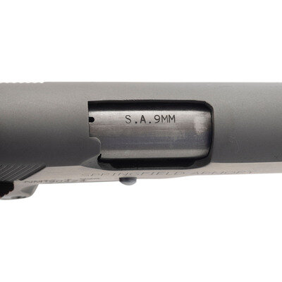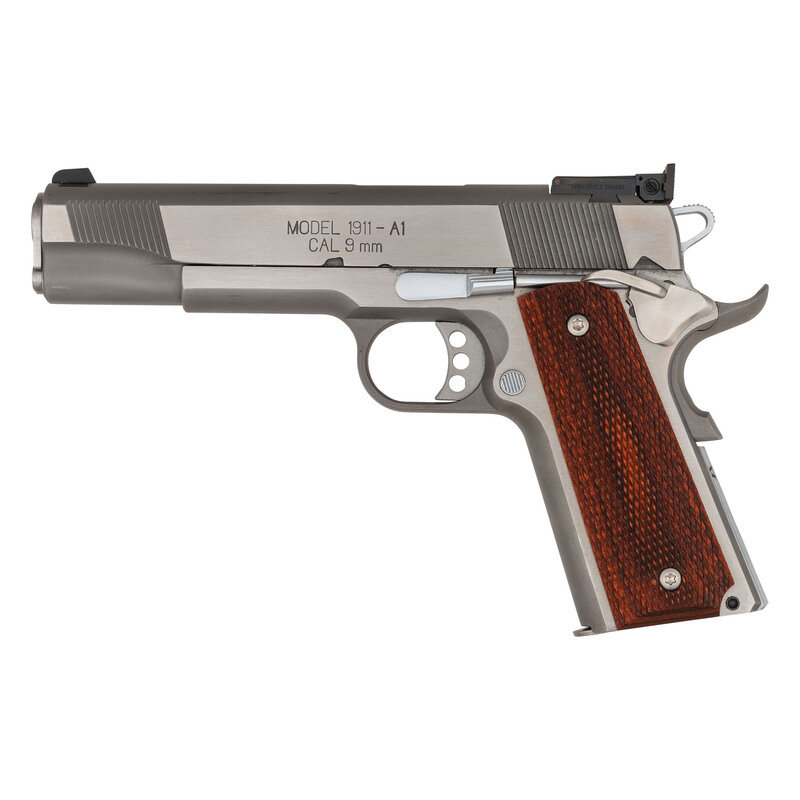 9mm Para. 5" barrel length. SN: NM190424. Brushed stainless steel finish to flats with matte finish on the rounds and mounting checkered laminated wood grips. Short recoil operated single action autoloading pistol mounting matted adjustable rear target notch and front blade sights. Item features front and rear cocking serrations, ambidexterous safety lever, recoil spring assembly, and a skeletonized Commander hammer. Shows standard make and model markings. Comes with two stainless Metalform marked magazines, and two blued Colt magazines in their packages.