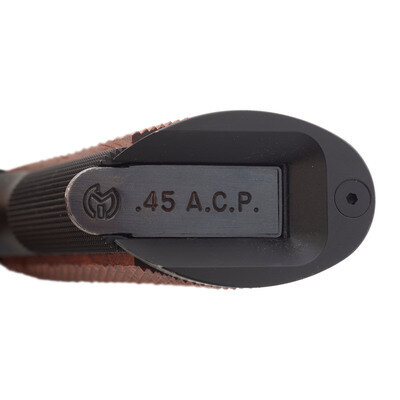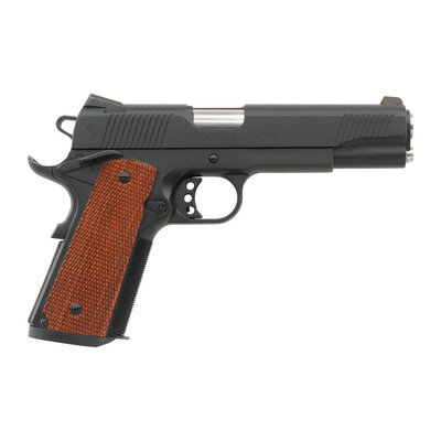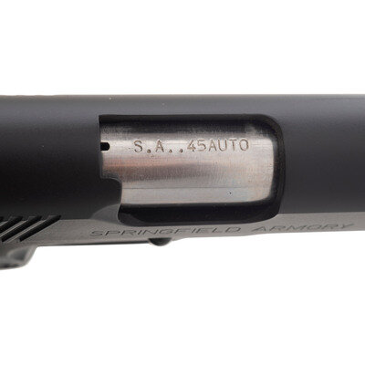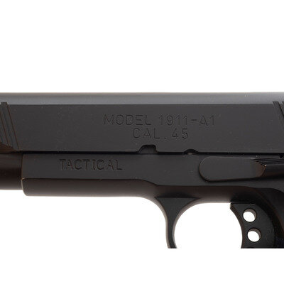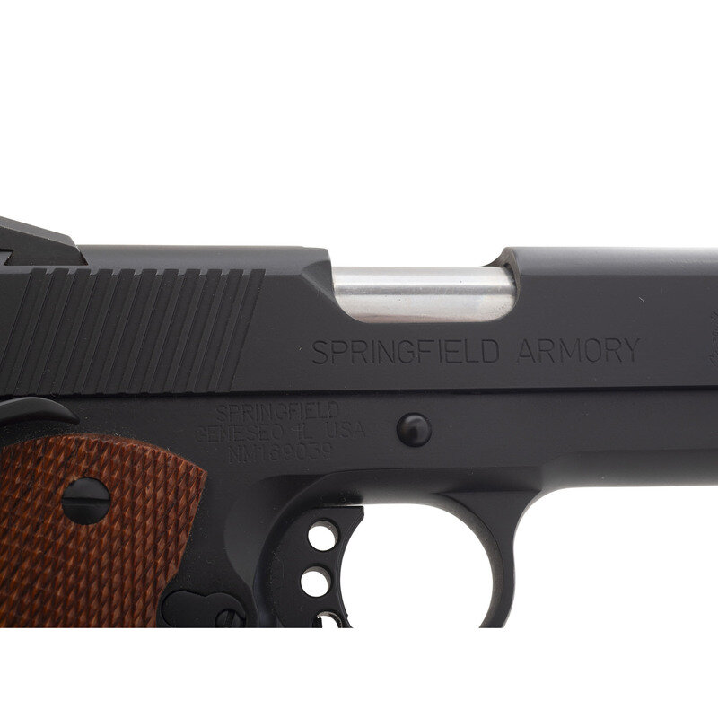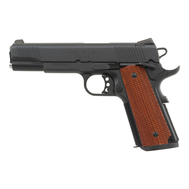 .45 ACP. 5" barrel length. SN: NM169039. Black Cerakote finish with a polished barrel and mounting checkered wood grips. Short recoil operated single-action autoloading pistol fed by detachable single stack magazines. Markings include the TRP mark on both sides of the slide with the right side showing the SPRINGFIELD ARMORY marking followed by the {Crossed Cannons} logo. Left slide displays the model marking MODEL 1911-A1/CAL. 45 with the left frame marked TACTICAL. The handgun features front and rear cocking serrations, an adjustable speed trigger, and extended beavertail. Controls include a skeletonized Commander hammer, ambidexterous extended safety, and an extended slide stop. The frame mounts a flat mainspring housing with both the housing and front gripstrap checkered. Internally, the slide carries a full length guide rod for the recoil spring, and a Springfield Armory marked match grade barrel with the serial number matching the frame. A detachable flared magazine well extension is attached to the butt. Comes with one Metalform marked blued magazine.