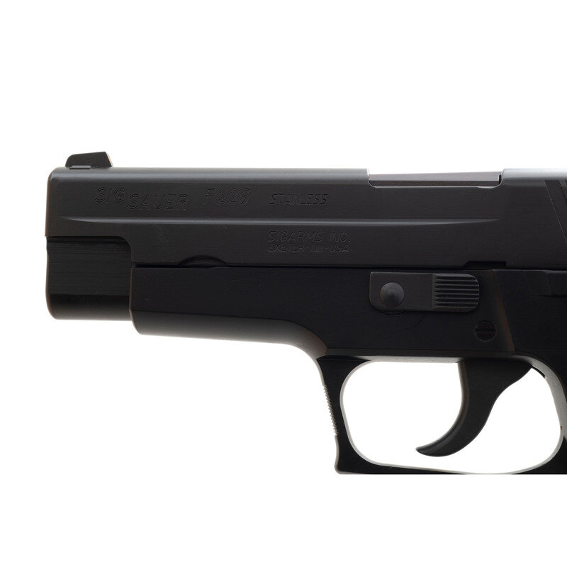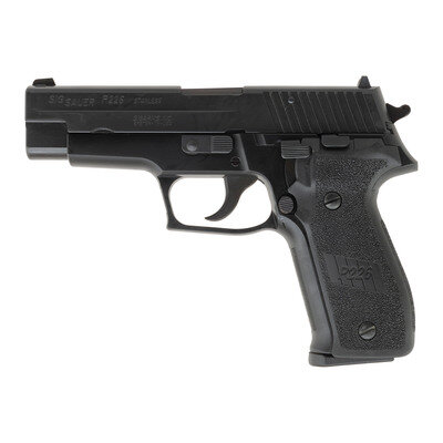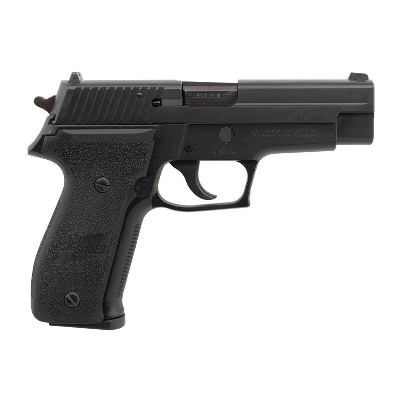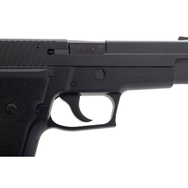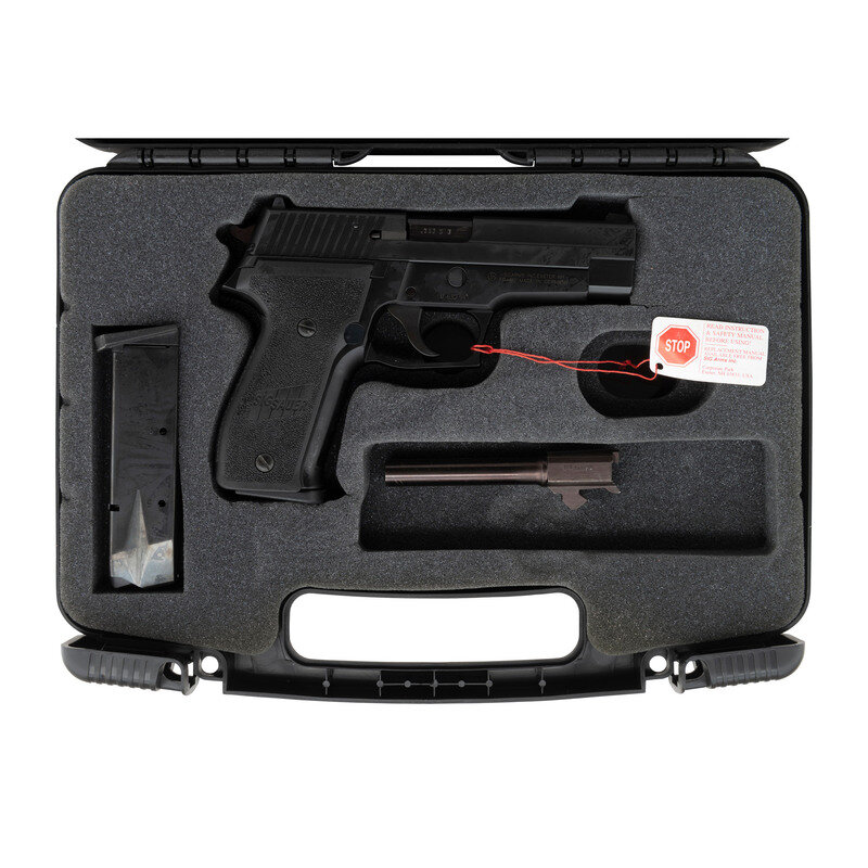 .357 Sig. 4.4" barrel length. SN: U630941. Black Nitron finish to stainless steel parts and black anodized frame with black synthetic stocks and mounting fixed two-dot sights. DA/SA short recoil operated autoloading pistol fed by detachable double stack magazines. Item shows standard make and model markings indicating it was manufactured in Germany. Item comes in a black Sig marked hard case containing the owner's manual, two magazines, and a SIG SAUER marked .40 S&W barrel. A safety tag remains attached to the triggerguard, and the extra magazine and barrel are both wrapped in plastic.