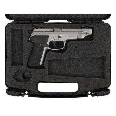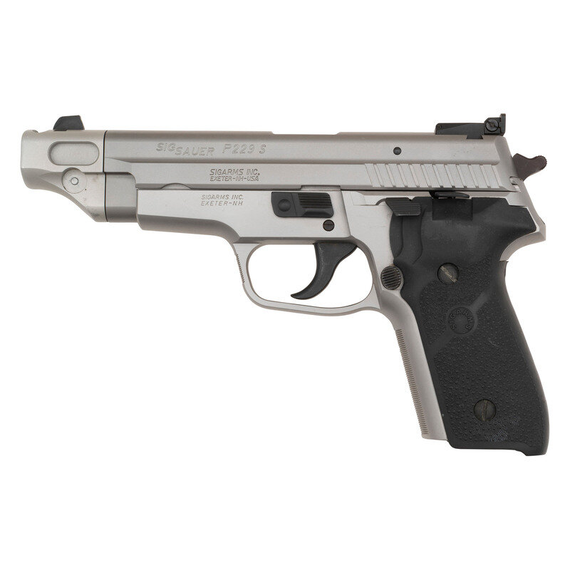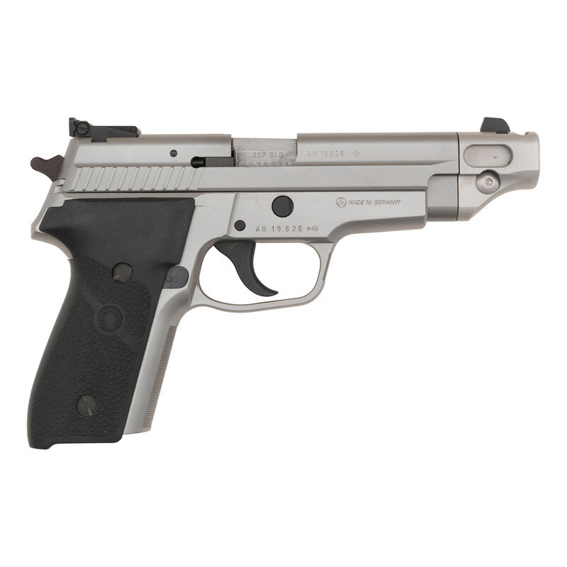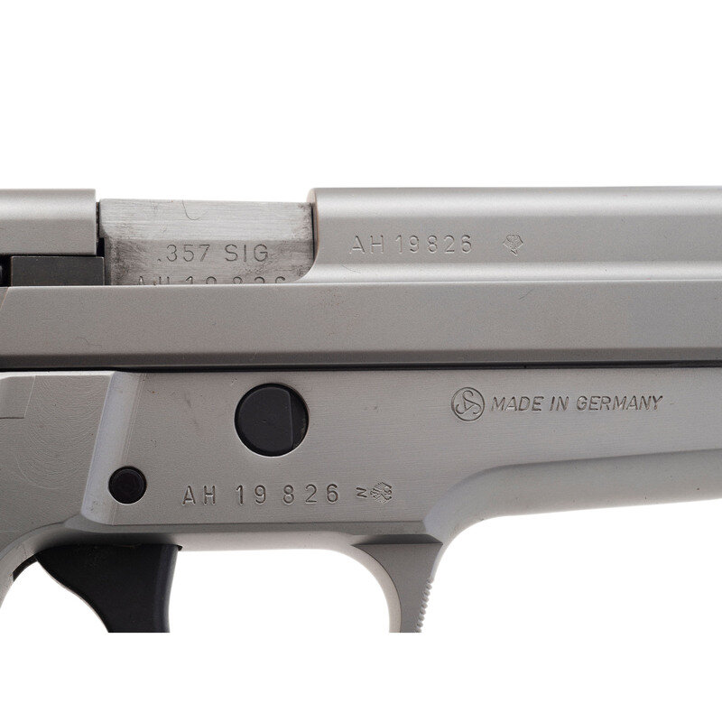 .357 Sig. 4.4" barrel length. SN: AH19826. Matte hard chrome finish overall with black rubber SIGARMS marked grips. Short recoil operated DA/SA autoloading pistol fed by detachable double stack magazines and mounting a combination barrel weight/compensator that mounts the front sight. Rear sight is a fully adjustable rear notch. The slide stop and magazine release are both enlarged models. Item shows standard German manufacture marks including German proofs on all major components. Comes in its original black synthetic hard case without accessories. Item comes with no magazine.