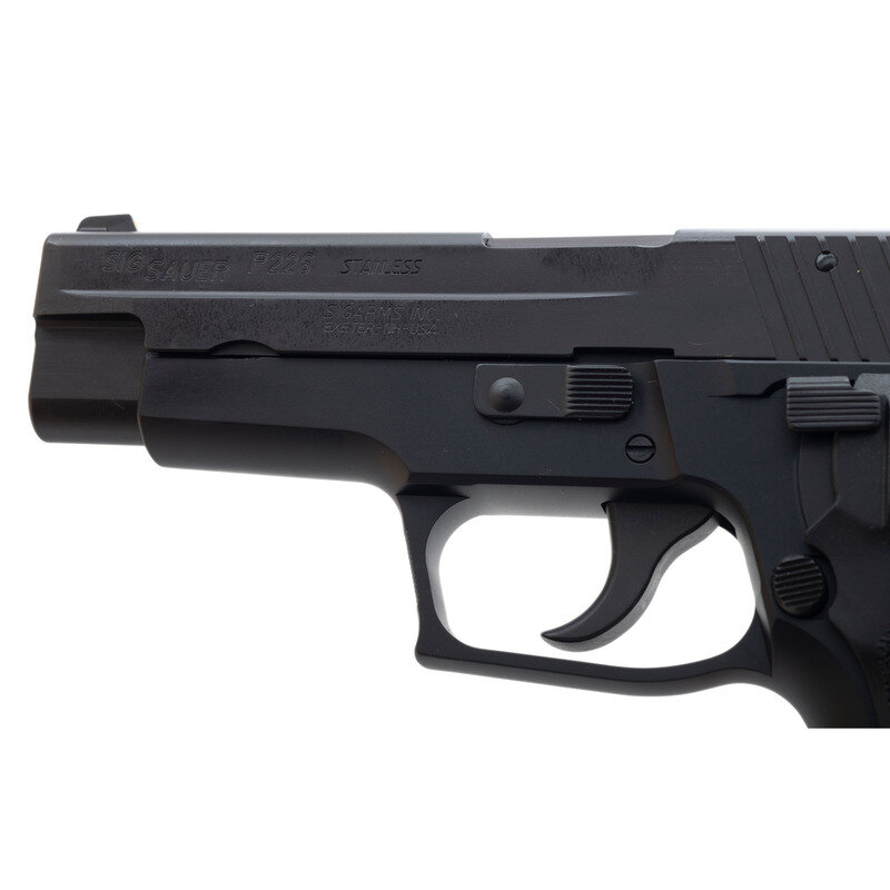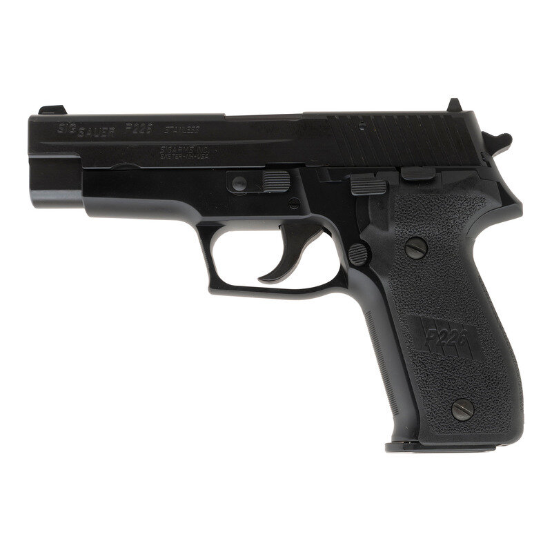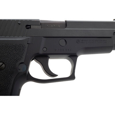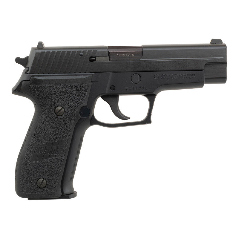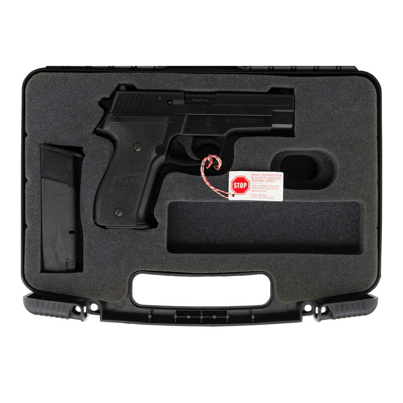 9mm Para. 4.4" barrel length. SN: U625264. Black Nitron finish with black anodized frame mounting black SIGSAUER marked synthetic grips and two dot sights. Short recoil operated DA/SA autoloading pistol fed by detachable double stack magazines. Item displays standard make and model markings overall, and comes in a black SIG SAUER marked synthetic hard case with two ten-shot limited capacity magazines and the owner's manual.