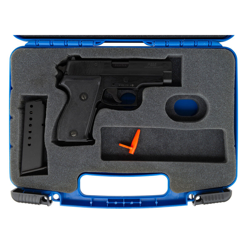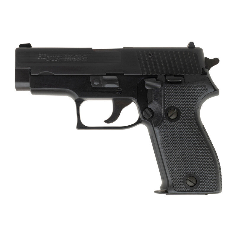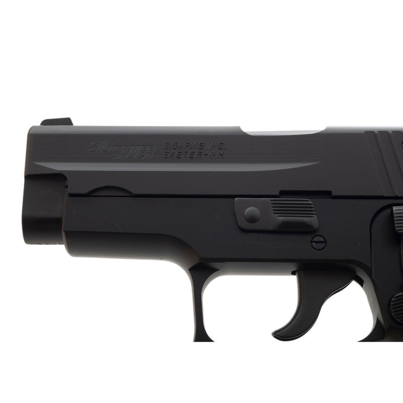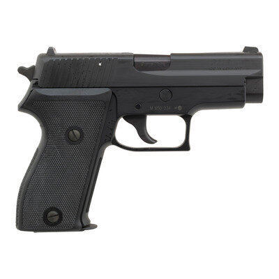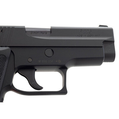 9mm Para. 3.9" barrel length. SN: M650234. Black Nitron finish with anodized frame mounting black synthetic grips. Short recoil operated DA/SA autoloading pistol fed by detachable single stack magazines. Item mounts fixed two-dot sights and the standard SIG pattern controls. Standard make and model markings appear overall, including German proof markings to major components. Comes in its original blue plastic hard case with the owner's manual, apparel catalog, and training course flyer. Also included are two magazines.