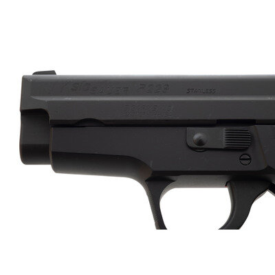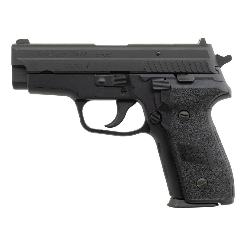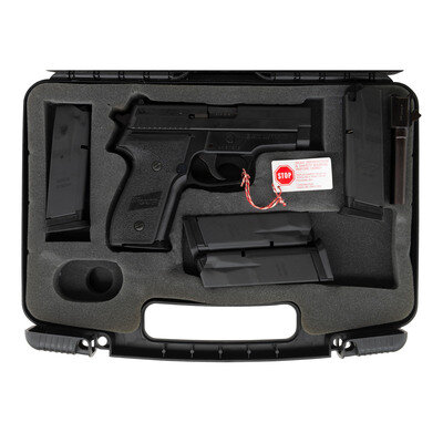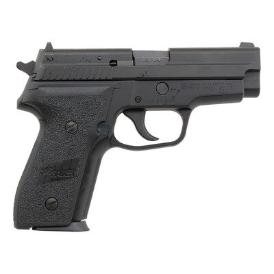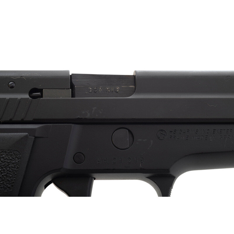 .357 Sig. 3.9" barrel length. SN: AH21219. Black Nitron finish with black anodized frame and mounting black synthetic SIGSAUER marked grips. Short recoil operated DA/SA autoloading pistol fed by detachable double stack magazines. Item shows standard make and model markings, and mounts fixed two dot sights. Included with the pistol are Sig manufactured barrels in both .357 Sig and .40 S&W. Item comes in a black synthetic case with accessories including five magazines, and the aforementioned .40 S&W barrel.