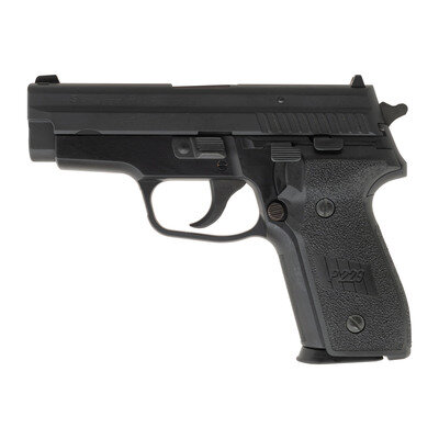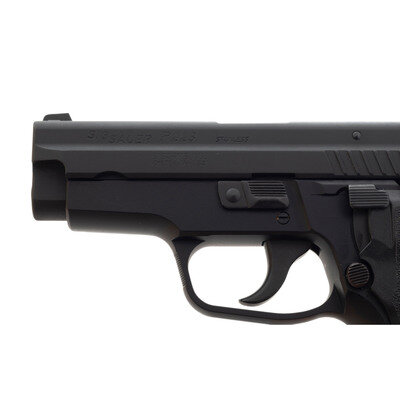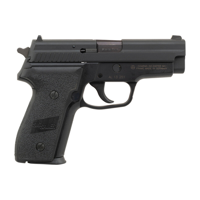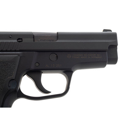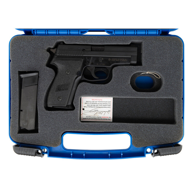 9mm Para. 3.9" barrel length. SN: AL13251. Black Nitron finish with black anodized frame and black synthetic grips. Short recoil operated DA/SA autoloading pistol fed by detachable double stack magazines. Item shows standard make and model markings overall, and comes in a blue plastic hard case with accessories. Included in the case are two ten-shot limited magazines, the owner's manual, and a detached Sig Sauer inspector tag.