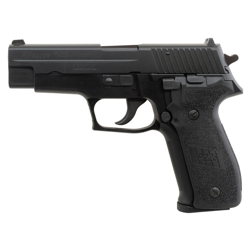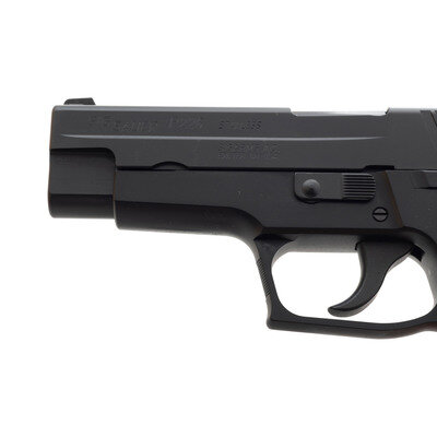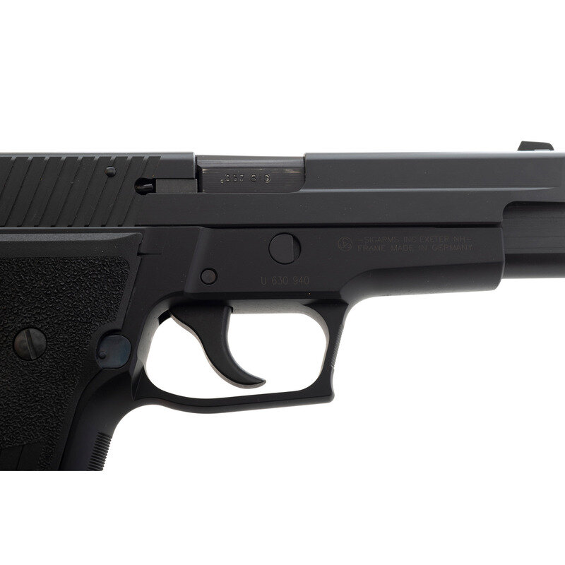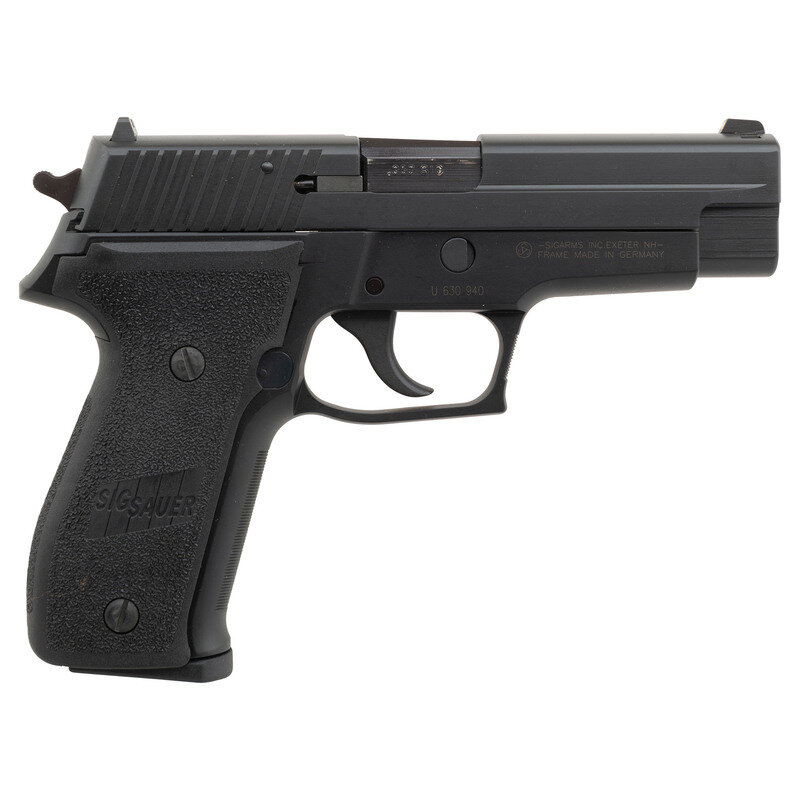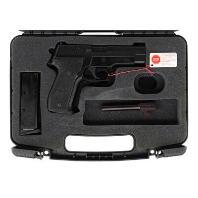 .357 Sig. 4.4" barrel length. SN: U630940. Black Nitron finish with black Anodized finish to the frame and mounting black synthetic SIG SAUER marked grips. Short recoil operated DA/SA autoloading pistol fed by detachable double stack magazines. Item shows standard make and model markings including the FRAME MADE IN GERMANY marking to the right side. Included in the case are two magazines, a .40 S&W caliber barrel with SIG SAUER manufacture marks, and the owner's manual.