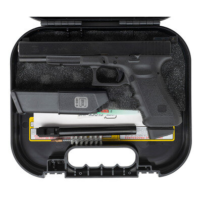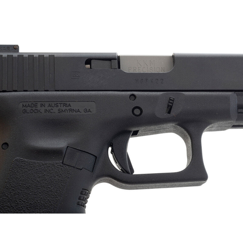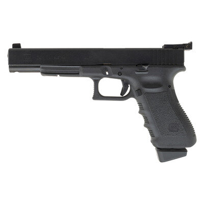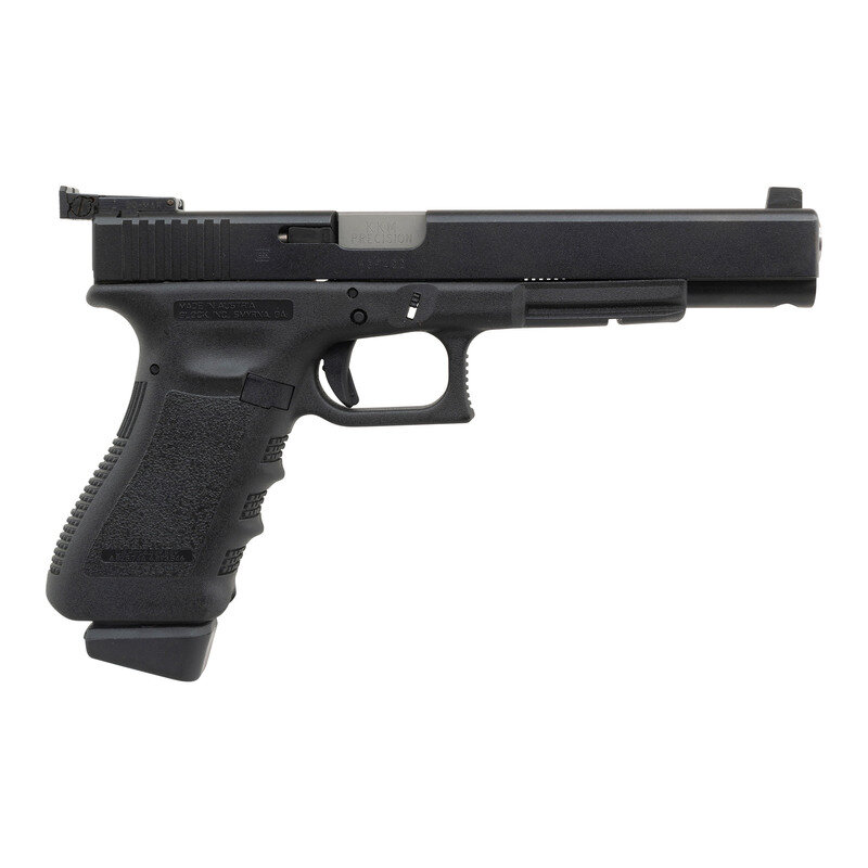 .357 Sig. 6" barrel length. SN: HGF422. Black Gen 3 Glock "frying pan" finish with black synthetic frame featuring a mounting rail and extended slide stop and magazine release. Short recoil operated striker action autoloading pistol fed by detachable double stack magazines. Item mounts fully adjustable matted BO-MAR front and rear sights, and features a ported forward slide with both barrels completed without ports. Item shows standard make and model markings overall, and the item comes with the original matching .40 S&W barrel and a .357 SIG caliber KKM/PRECISION barrel. Comes in its matching black plastic hard case with the owner's manual in its package, a Ghost Block locking backplate kit, and a nylon bore brush. Also included are two magazines including one with a standard baseplate and one with an extended baseplate.