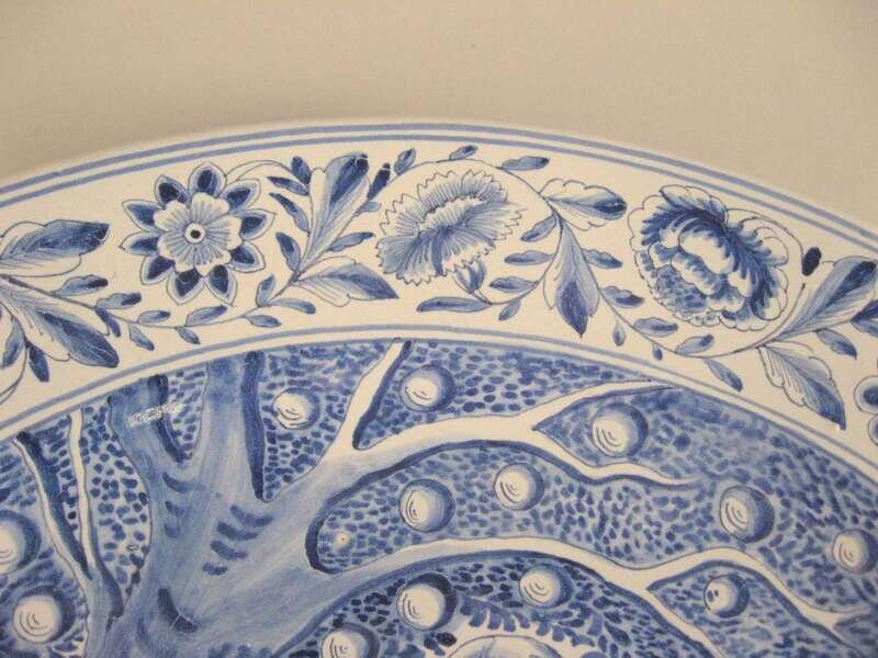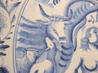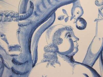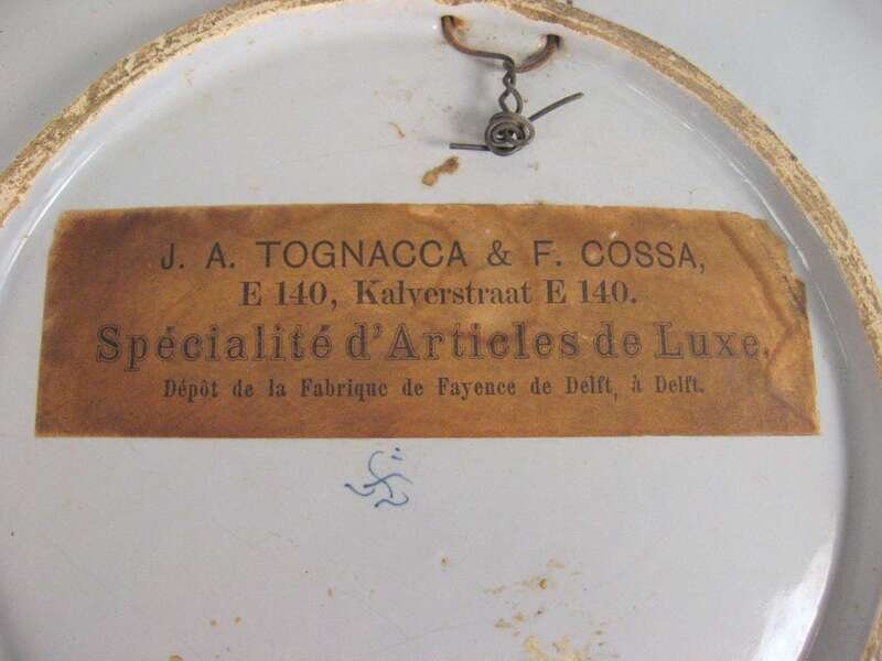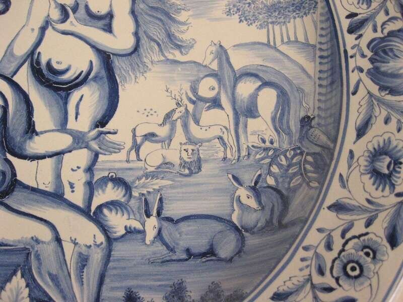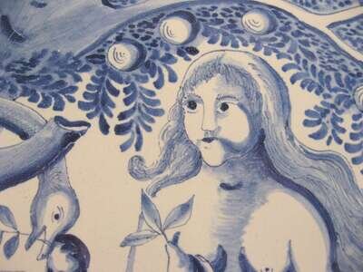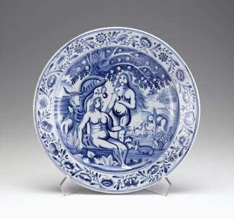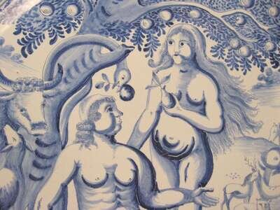 Depicting Adam seated beneath an apple tree with Eve standing beside offering fruit, a variety of animals in the background, the border decorated with scrolling floral garlands, the reverse bearing paper retailer's label 'J.A. Tagnacci & F. Cossa/ Specialite d'Articles de Luxe'.