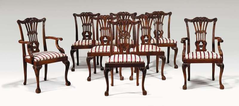 Comprising a pair of armchairs and six sidechairs, each with an elaborately carved and pierced backrest, with a drop in seat and raised on shell carved cabriole legs ending in ball and claw feet. (8).