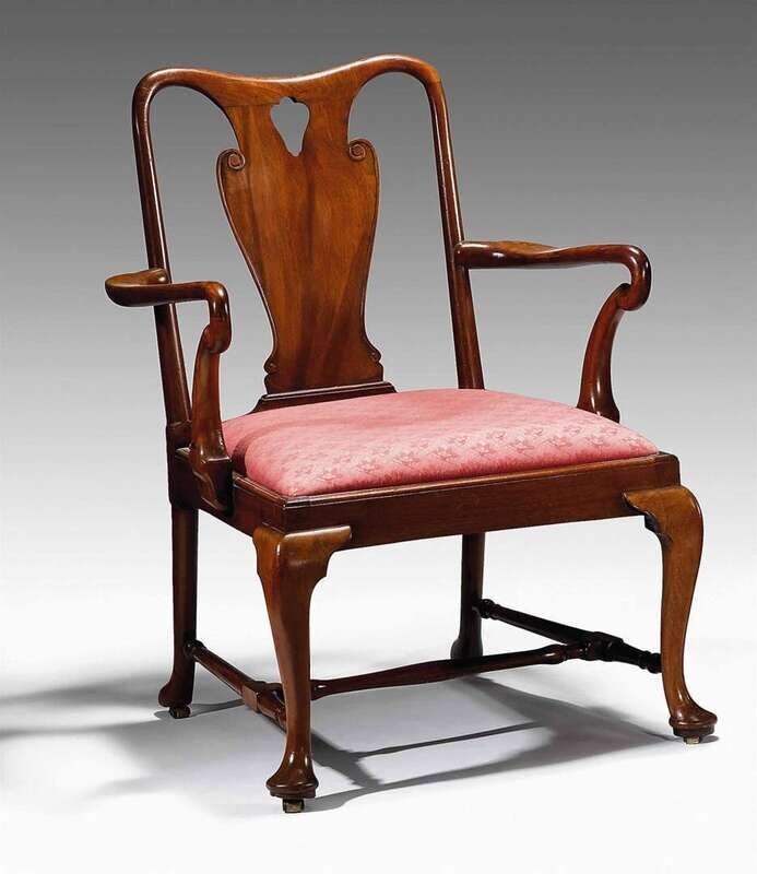 With a vasiform backrest and curved armrests, the drop-in seat raised on cabriole legs ending in pad feet joined by stretchers.