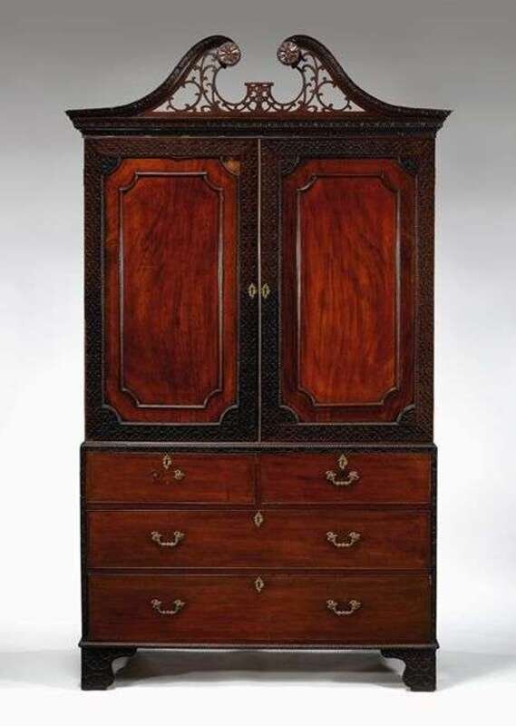 The carved and pierced fretwork cornice above a pair of paneled doors with blind fretwork framing, the interior fitted for shelves, above two short drawers and two long drawers, raised on blind fretwork carved bracket feet.