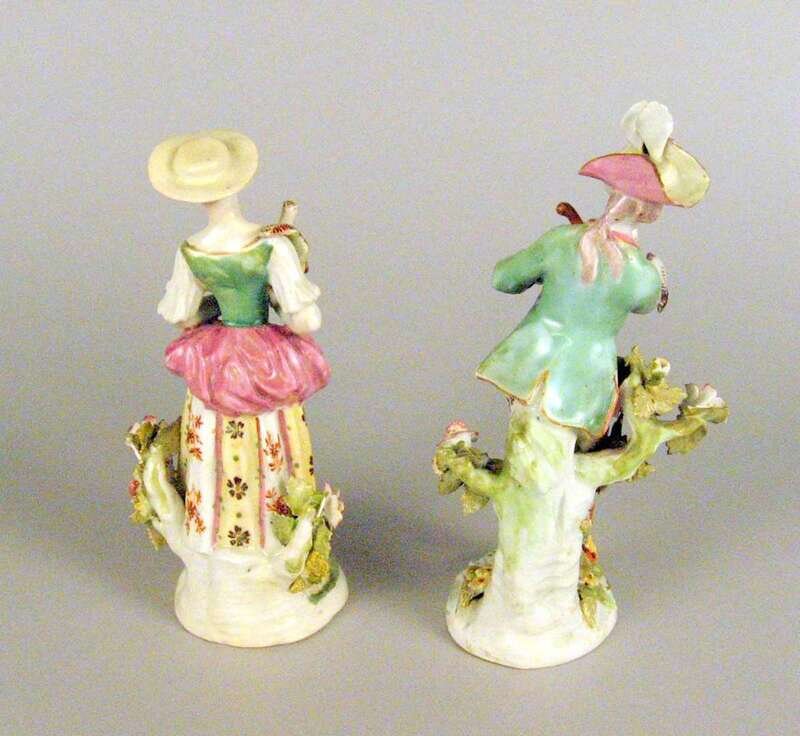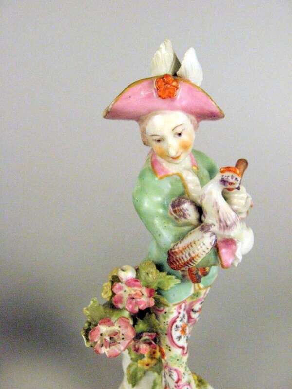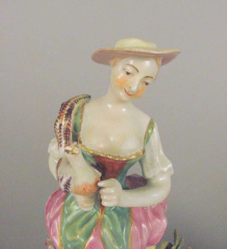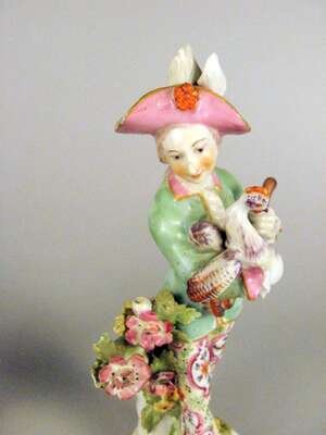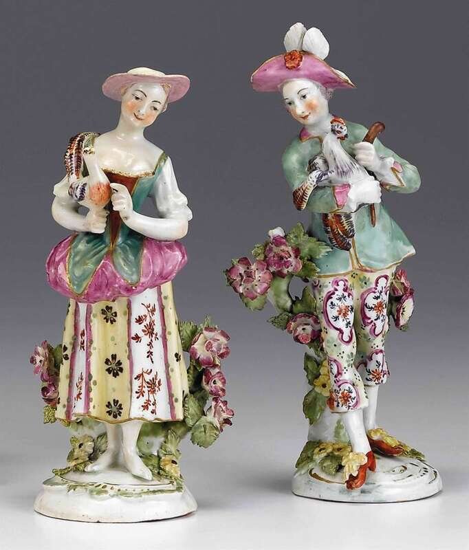 Modeled as a standing figure wearing a plumed hat and holding a cockerel, his barefoot companion holding a pheasant. (2).