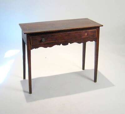 The rectangular top with serpentine banding above a frieze drawer, raised on square tapered legs.