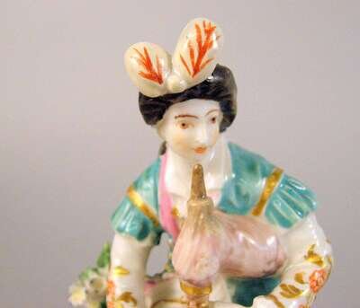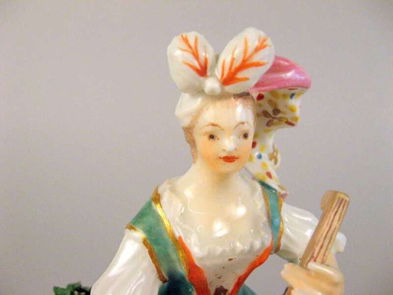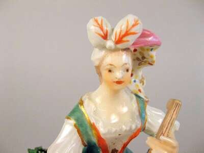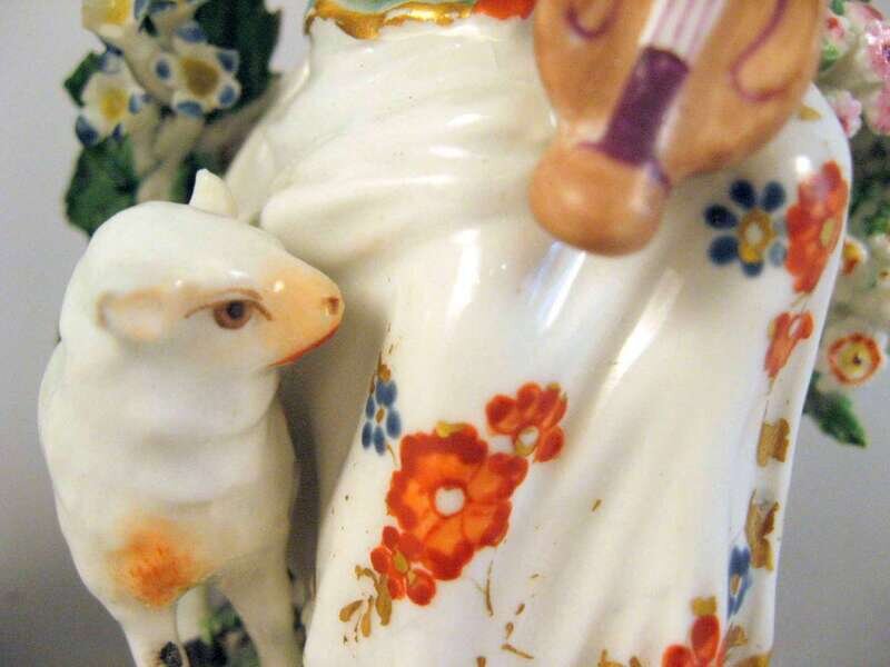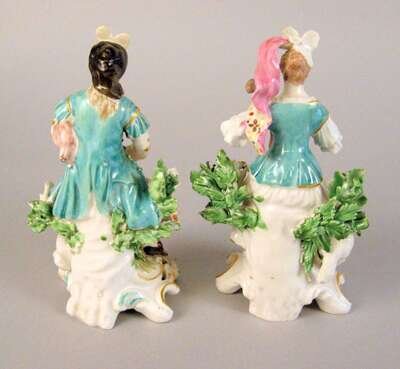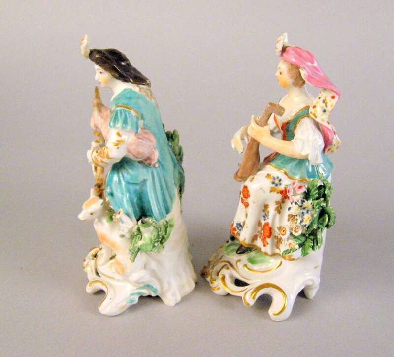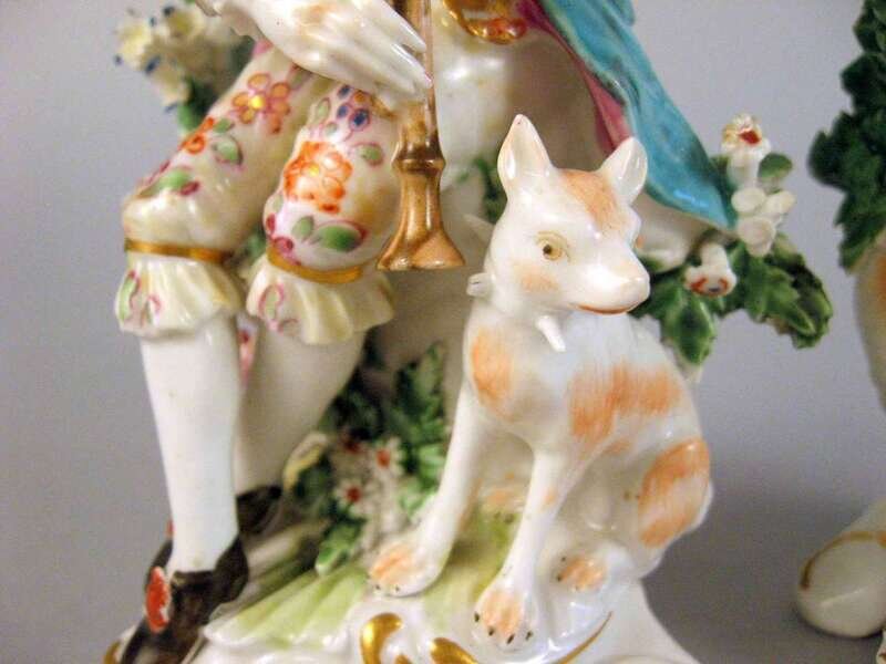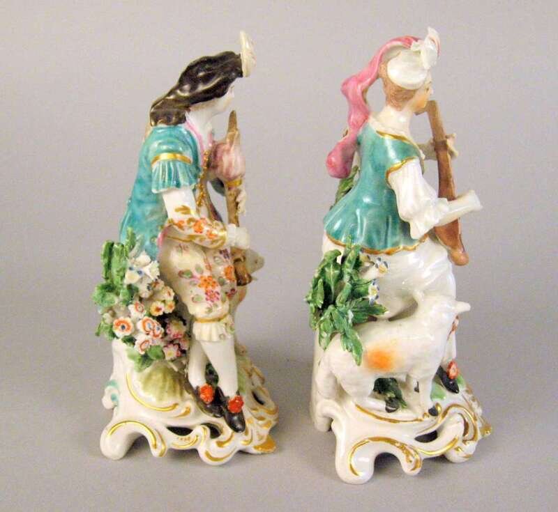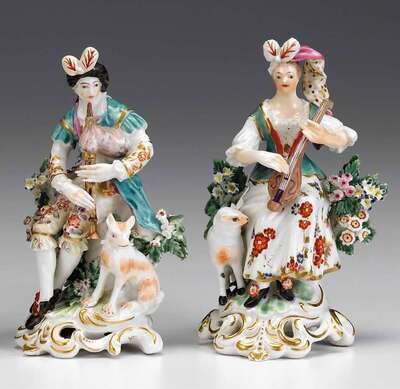 Modeled as a man playing bagpipes, a dog at his feet, his companion playing a lute, a lamb at her feet, both figures seated against bocage and raised on pierced rococo bases. (2).