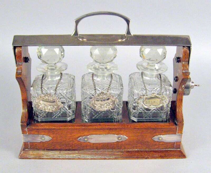 Sheffield silver plated oak and cut glass tantalus