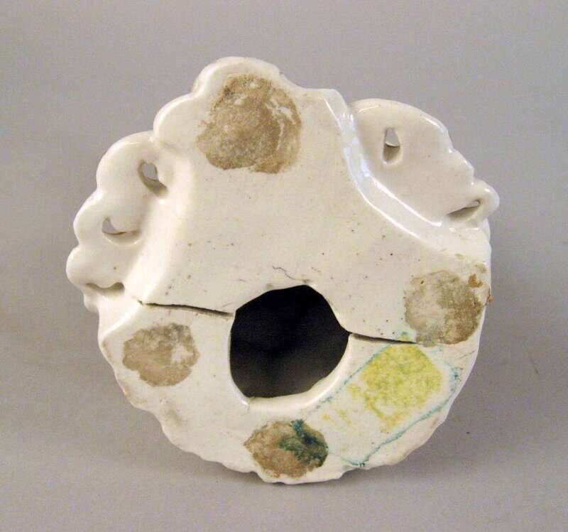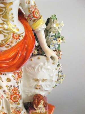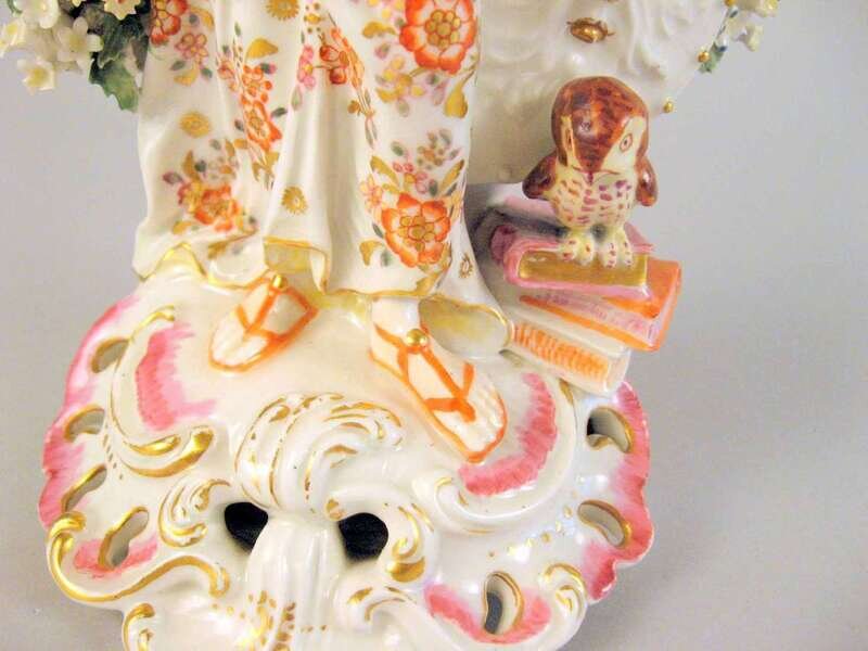 Modeled as a figure standing beside an owl seated on a stack of books, her hand resting on a shield molded with Medusa's head, on a pierced scrollwork base, with enamel and gilt decoration.