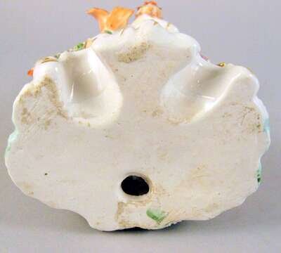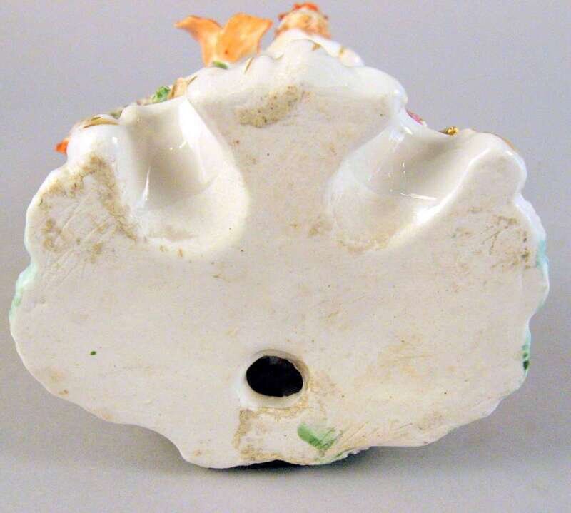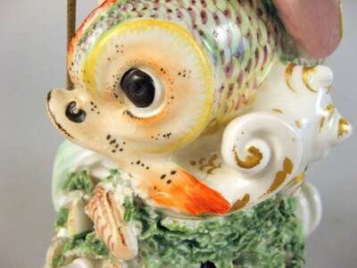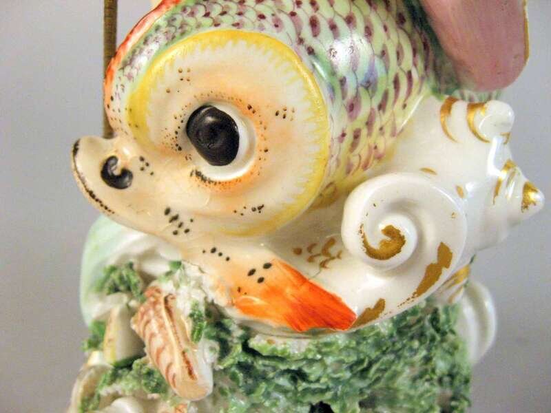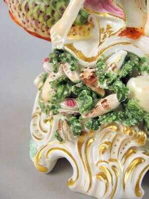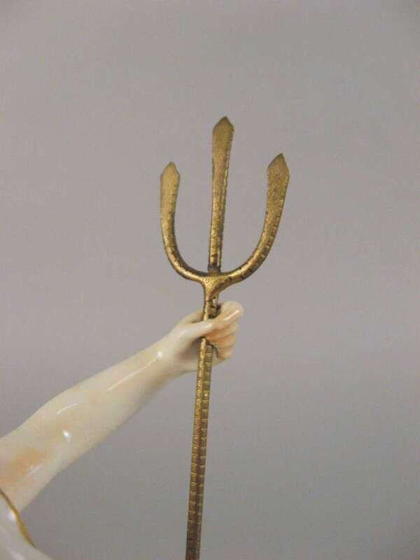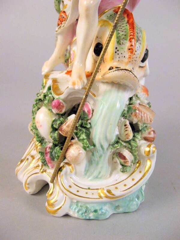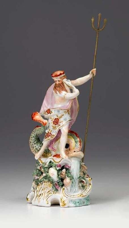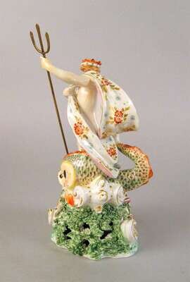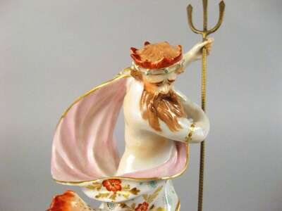 Modeled in billowing robes and standing beside a dolphin issuing water from its mouth, on a shell encrusted and scrollwork base, with a later metal trident.