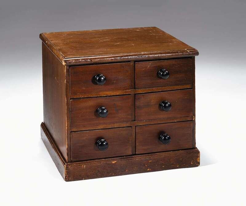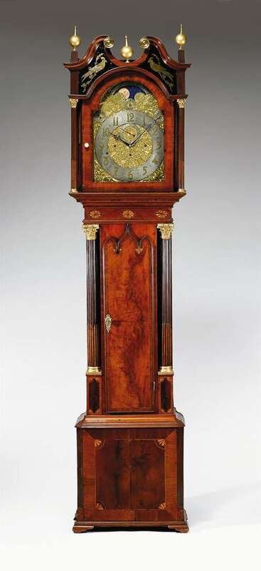 The dial with Arabic numerals signed J. Morrison, London surmounted by a phases of the moon dial, the elaborate movement with removable music cylinders set within a mahogany case with a gothic door flanked by freestanding Corinthian columns upon a rectangular base with canted forecorners, the hood with an arched pediment with ball and spire finials and eglomise panels; together with a small case fitted with additional music cylinders.