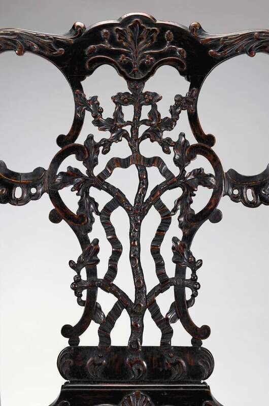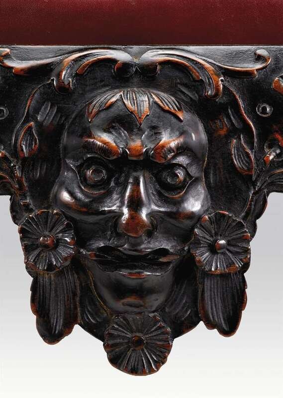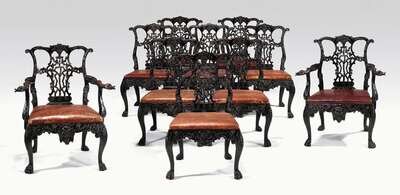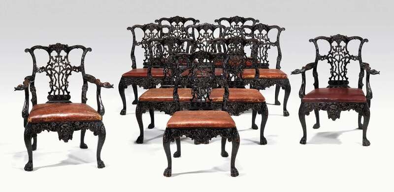 Comprising two armchairs and eight side chairs, each with a leaf carved toprail above an elaborately carved and pierced backsplat centered by a blossoming ribbon draped branch, the armchairs with carved serpent handrests above a leather drop-in seat, the seatrails carved with shells and scrolls, the armchairs centered by a mask, the sidechairs by a shell, raised on leaf carved cabriole legs ending in hairy paw feet. (10).