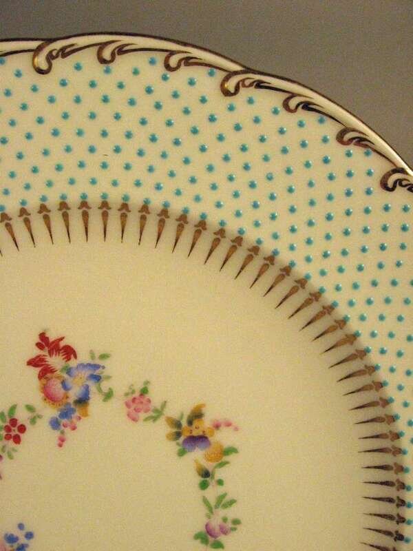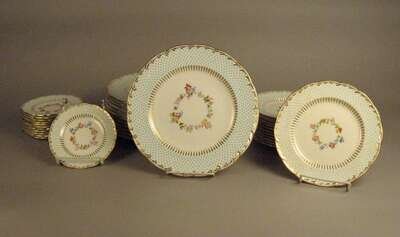 Comprising 12 dinner plates, 12 salad plates, and 12 bread plates, the shaped edges with turquoise 'jeweled' wide borders and gilt highlights, the centers painted with floral garlands, printed puce mark. (36).