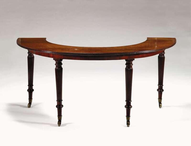 In the manner of Gillows, the demi-lune top with a reeded edge, formerly with hinged flaps, raised on four tapered fluted turned legs terminating in brass cappings and casters.