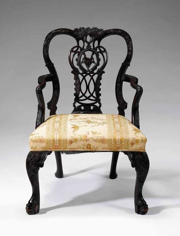 With a carved and pierced backrest and leaf carved armrests, raised on cabriole legs carved with floral motifs ending in dolphin form feet.