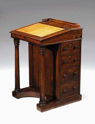 With a hinged leather inset top opening to an interior with two fitted drawers and two false drawers, a drawer to the side for writing implements above four drawers opposed by four false drawers, raised on columnar supports on an incurved base.