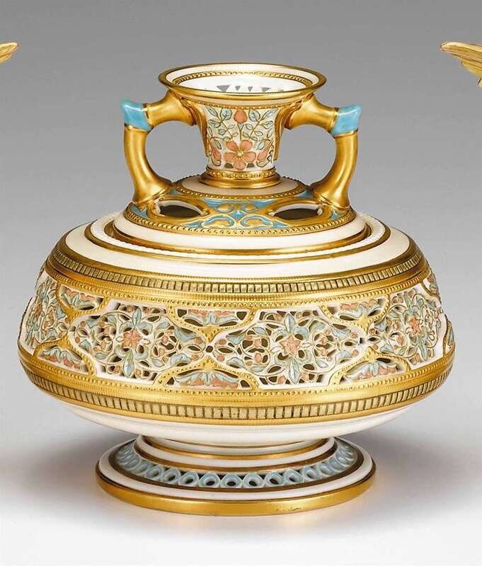 Of squat globular form, the removable insert top with angled loop handles and flower arranging holes, the lower section with a reticulated band of flowers and foliage at the waist in pale pink and green enamel, raised on a pierced circular foot, with raised gilt 'jewels' and gilt banded details, green printed mark, incised 744.