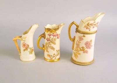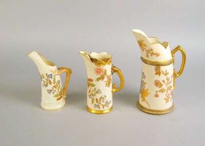 Group of three Royal Worcester porcelain gilt decorated ewers