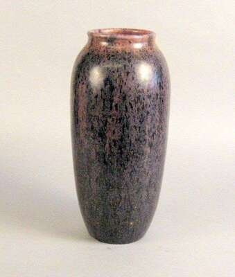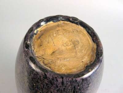 The cylindrical body with a slightly flared mouth, in a mottled purple and deep blue drip glaze, incised cross and 'Mortlake', with artist's monogram and date to underside.