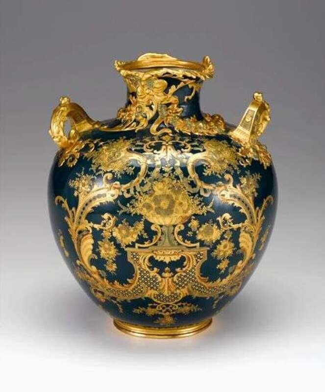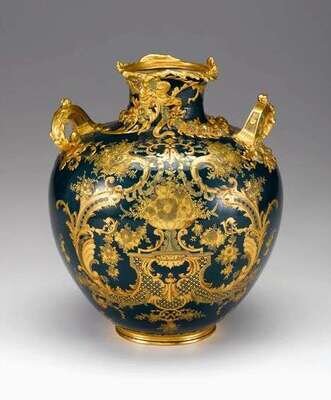 The globular body profusely decorated with raised gilt scroll and floral decoration, with molded floral swags and ribbons, the shoulders with offset scrolling handles, red printed mark, incised model number and decorator's monogram TW to underside.