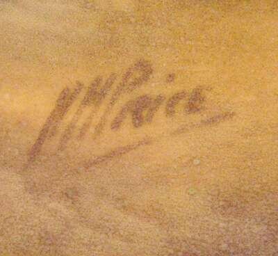 Painted with a study of peaches, grapes and berries on a wooded background, signed H. H. Price within a scalloped gilt border.