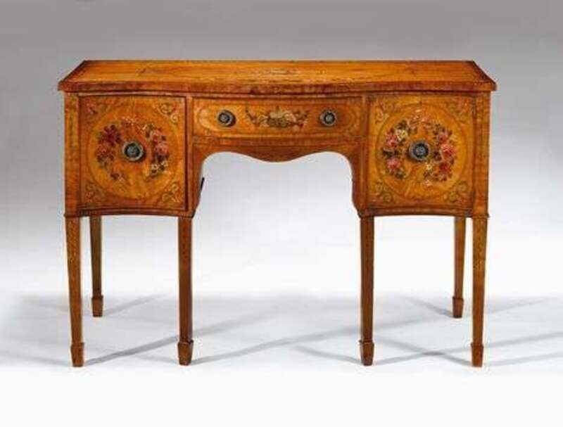 The top of serpentine outline painted with a musical trophy and floral garlands above a center drawer fitted for cutlery, flanked by a cupboard door and a deep drawer all painted with garlands and trophies, raised on square tapered legs ending in spade feet painted with bell flower trails.