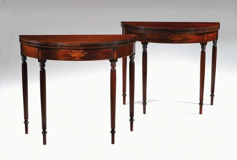 Each with a D-shaped hinged top above an apron veneered with a flower filled urn, raised on round tapered lobed legs. (2).