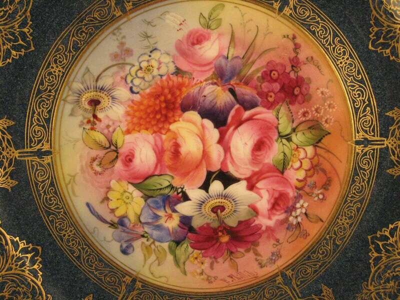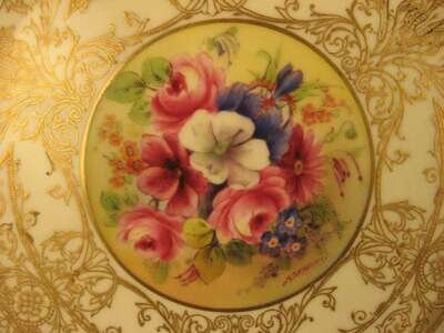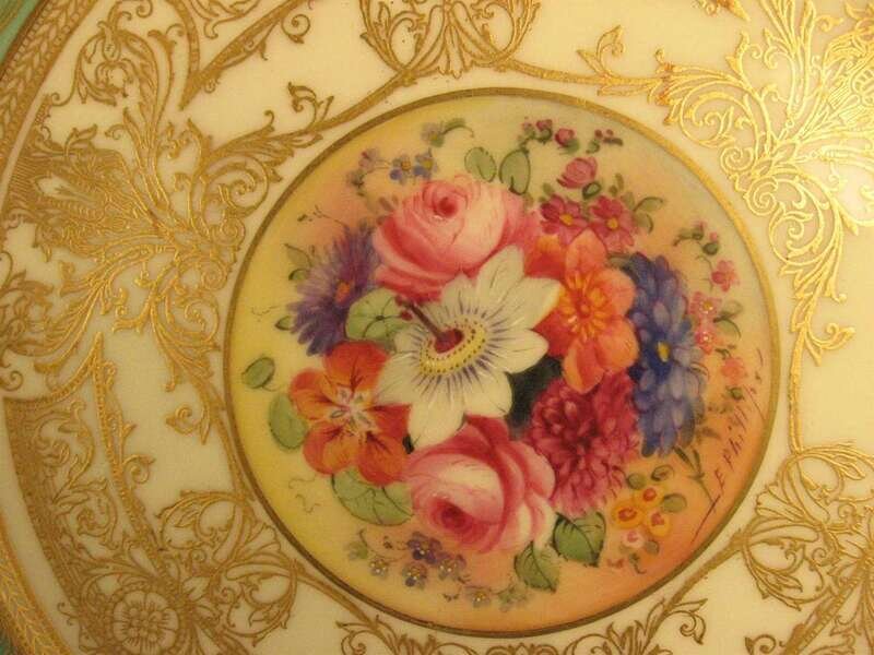 Two similarly painted with a central floral bouquet within a light green gilt decorated border, one signed E. Phillips, the other S. Stanley; the third with a larger floral painted center within a wide speckled blue and gilt decorated border, signed E. Phillips and retailed by Tiffany & Co. (3).