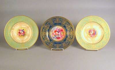 Three Royal Worcester floral painted and gilt decorated service plates