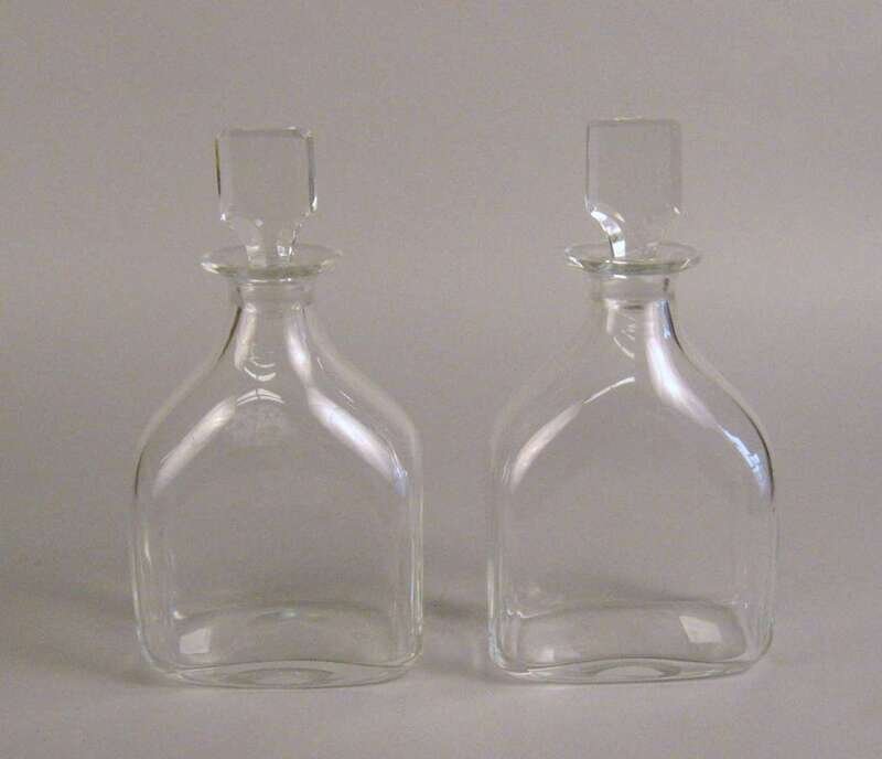 Each of flattened bottle form with a flattened and facetted stopper, the front panels engraved with the royal insignia, the reverse engraved 1937, acid etched marks to base. (2).