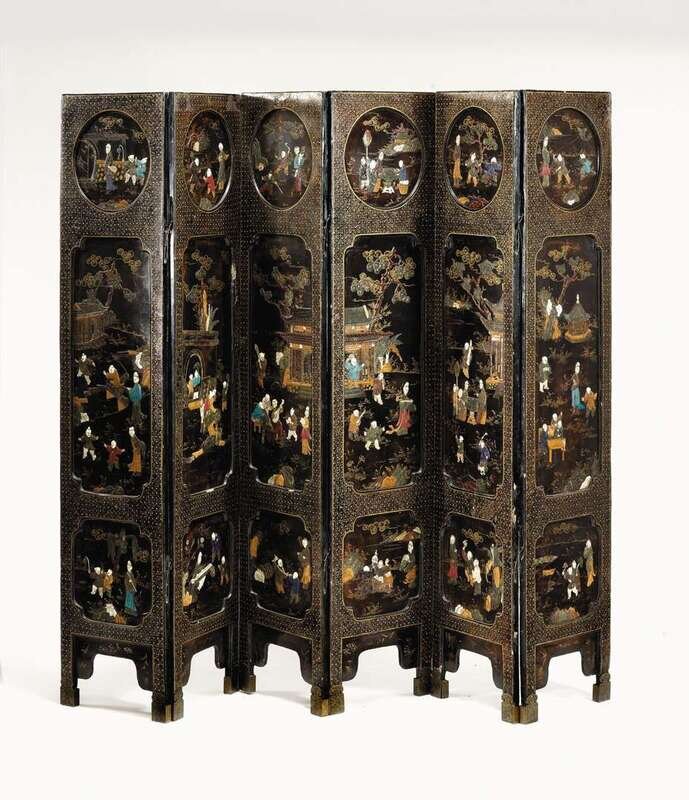 Each triple panel fold decorated in ivory, various hardstones, polychrome and gilt with figures, pagoda and foliage, the reverse painted with exotic birds and foliage.