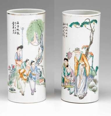 Each decorated with a scene of a scholar and children in a garden, with inscriptions. (2).