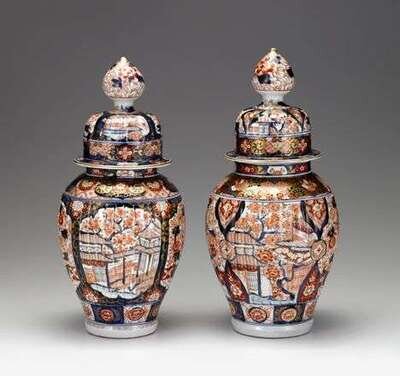 Two similar Imari pattern covered urns 19th century
