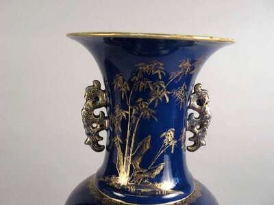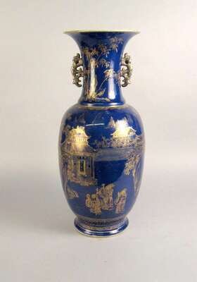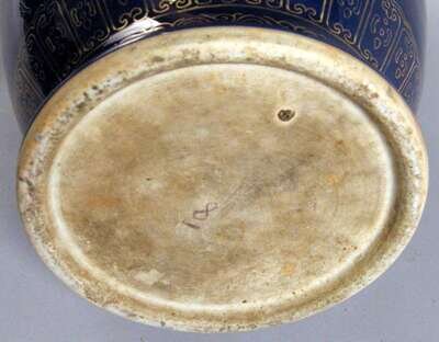 Of baluster form decorated with a village scene in gilt on a cobalt ground.