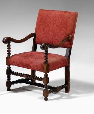 The padded back and seat with carved armrests and voluted supports, raised on turned legs, joined by carved barley twist stretchers.
