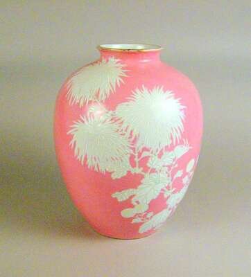 Of swollen ovoid form, incised and decorated with white enamel depicting chrysanthemums and other flowers against a pink ground, painted six character mark to underside and incised inventory number.