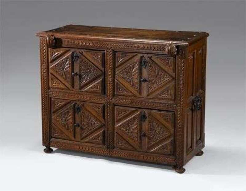 The rectangular top with a studded top above two shell carved supports and four drawers; the whole carved with foliate motifs, raised on bun feet.
