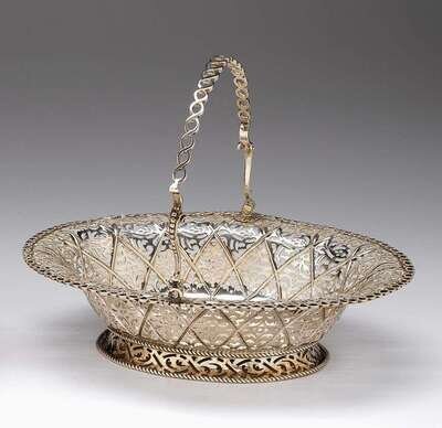 The entwined handle above a pierced bowl with a gadrooned edge, raised on an oval foot with rope twist edge.