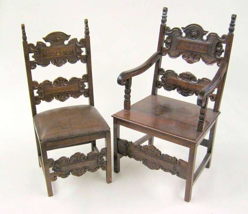 Including 2 armchairs and 6 side chairs, each backrest carved with scrolled slats above a padded seat raised on square legs. (8).
