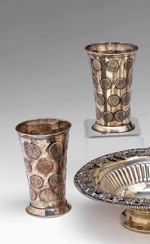Two Victorian sterling silver and coin mounted beakers james barclay hennell, london, 1881 & 1883