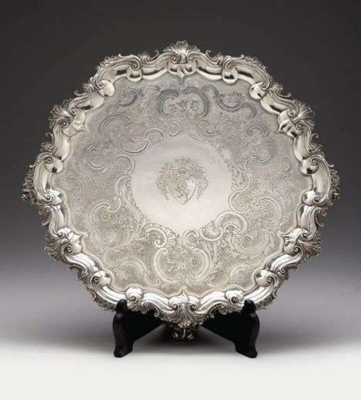 With an finely chased shell-cast rim, the central reserve engraved with a coat of arms surrounded by foliate and C-scroll bright cut decoration, raised on scrolling feet.