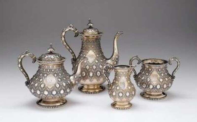 Comprising a teapot, coffeepot, cream jug and open sugar, each decorated throughout with a Moorish design, with beaded rim and foot. (4).